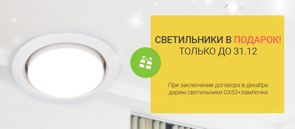 Акция: "Заключите договор до конца месяца. И получите белые светильники GX53 + лампочки в Подарок!" Более подробную информацию можно уточнить у наших менеджеров по телефону.