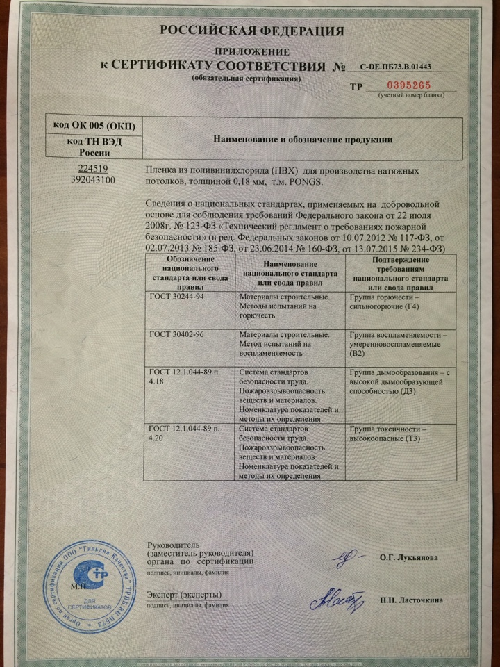 Мы регулярно отслеживаем сроки сертификации наших потолков, запрашиваем свежие документы в случае, если срок предыдущих истек, чтобы убедиться, что мы предоставляем вам качественный продукт. Также, по вашему желанию, мы предоставим вам сертификаты на все комплектующие, если, конечно, они подлежат обязательной сертификации. Если же какой-либо из элементов не сертифицируется по Российскому законодательству – мы предоставим отказное письмо.