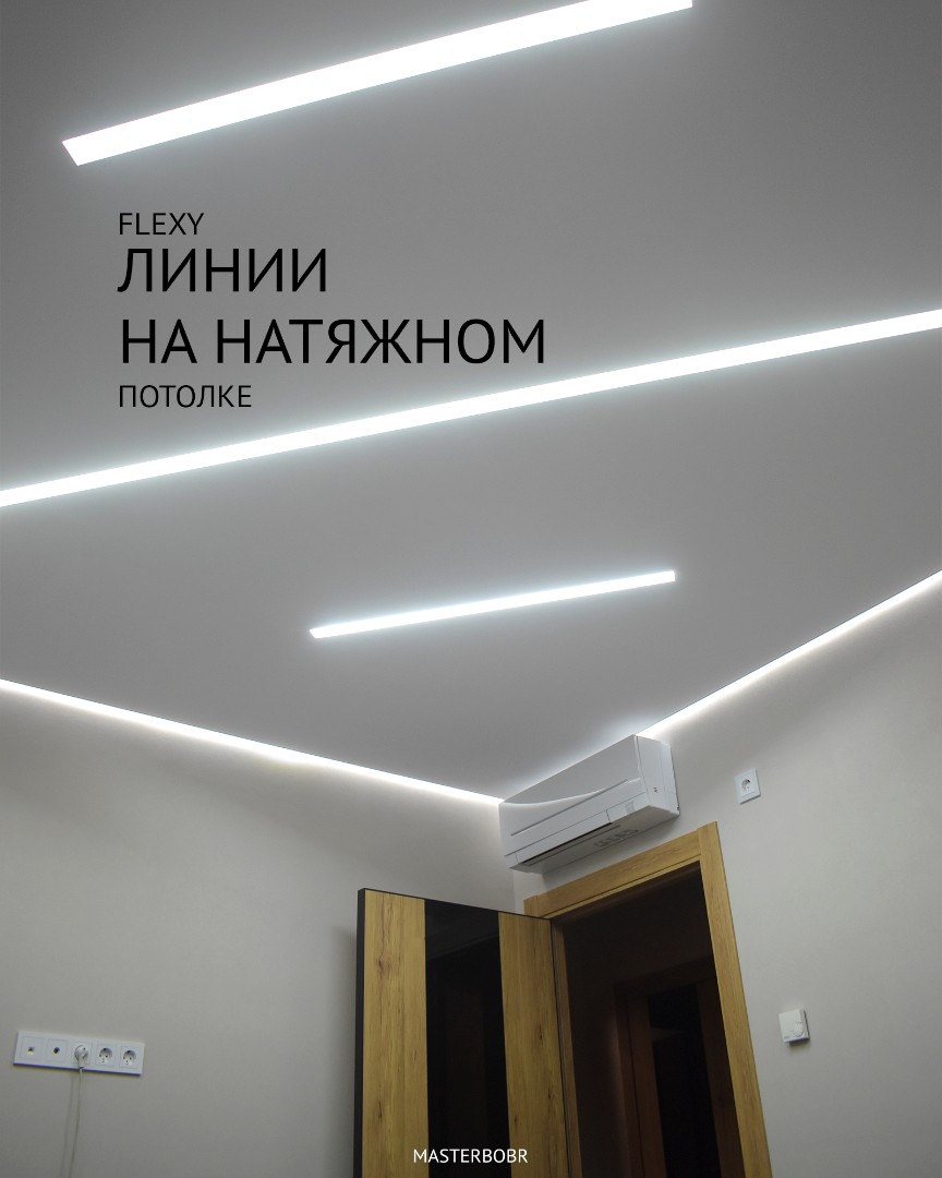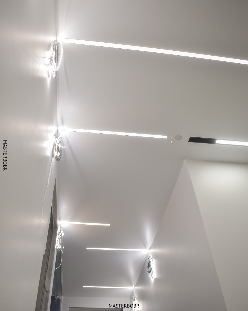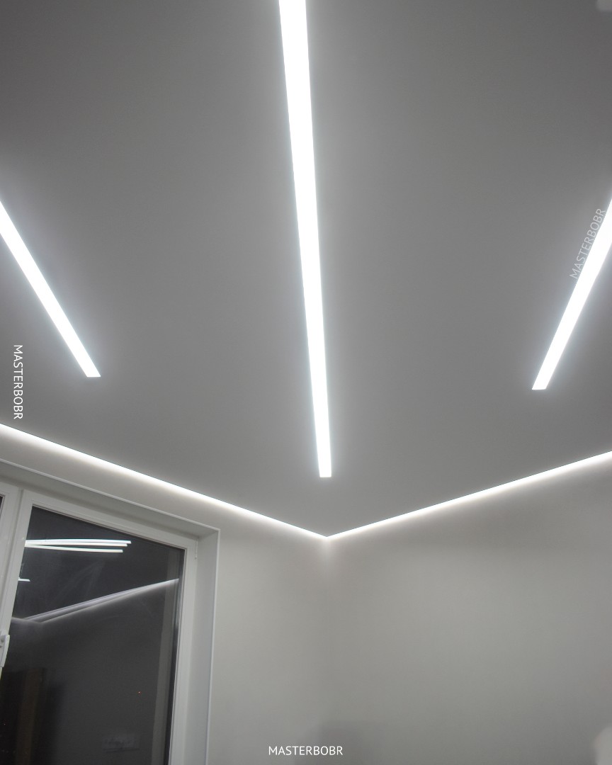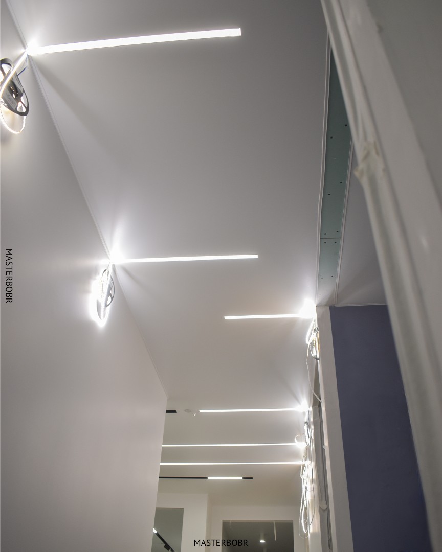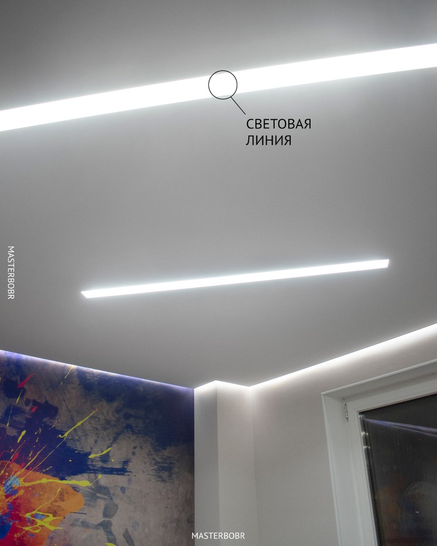 Световые линии при грамотной расстановке освещают комнату ярким и равномерным светом. Это происходит благодаря тому, что мощная светодиодная лента закрывается декоративной вставкой, которая рассеивает свет.