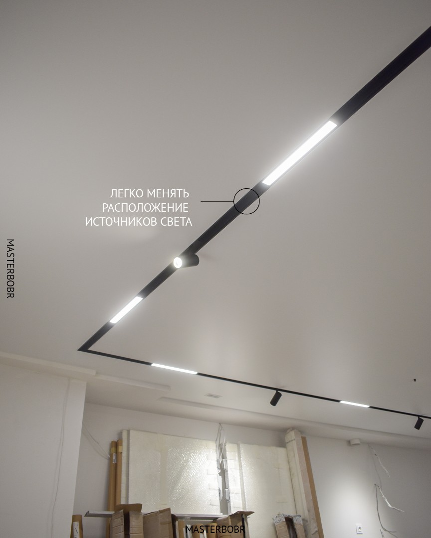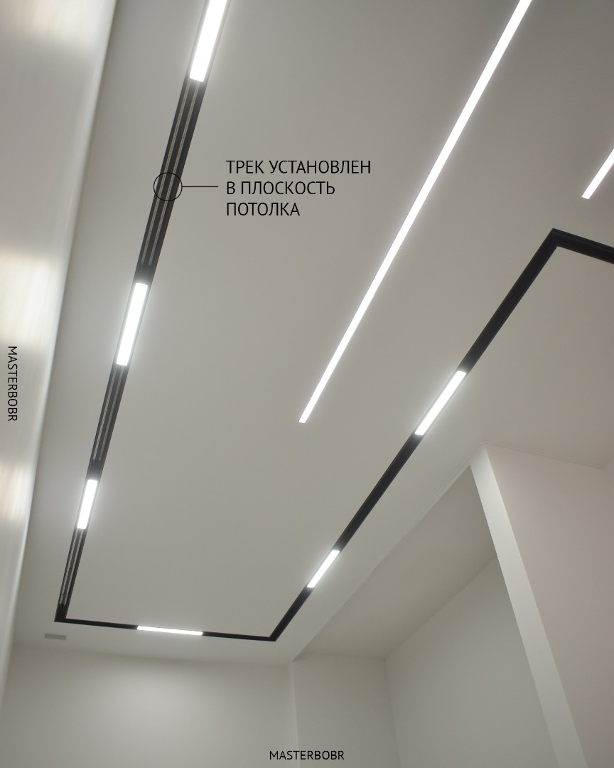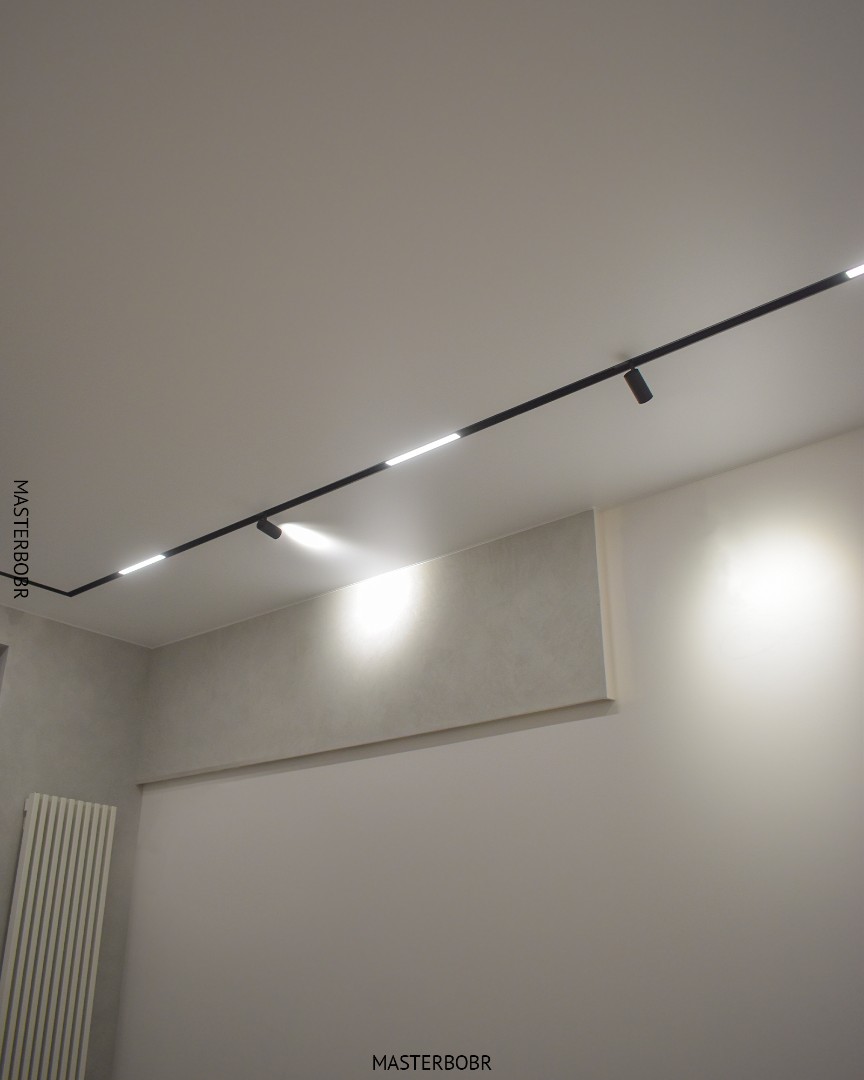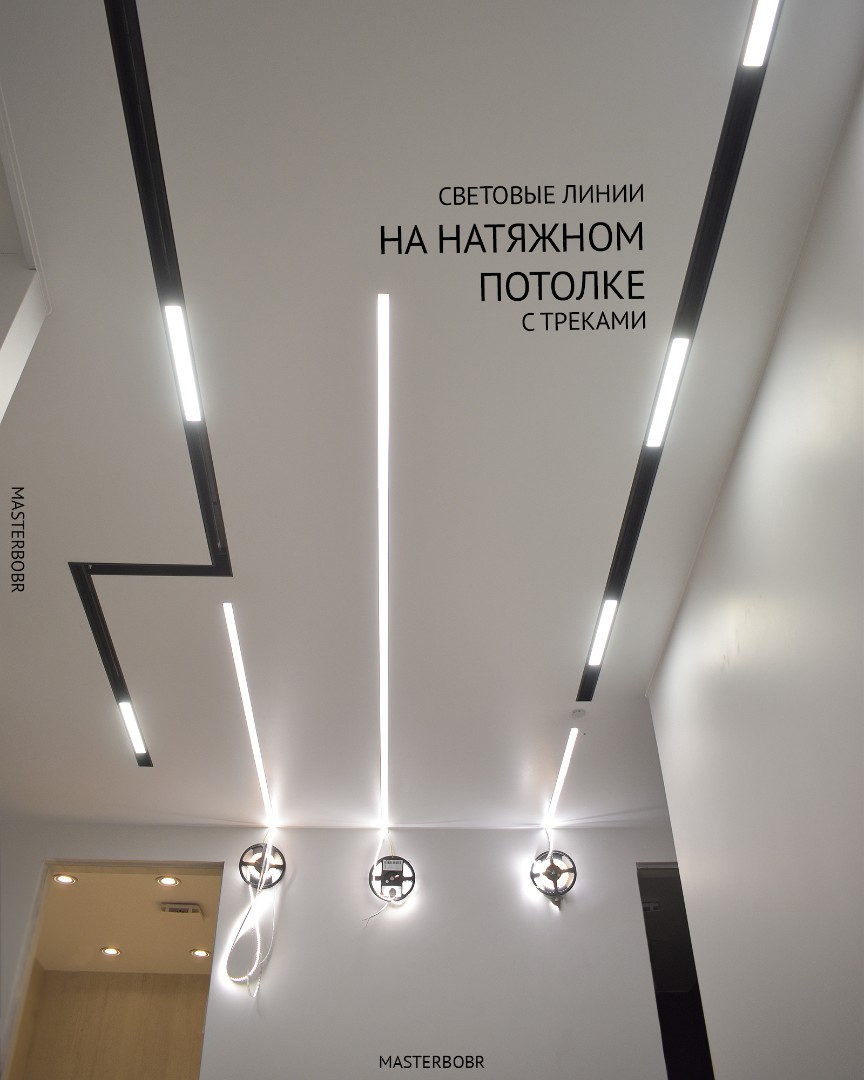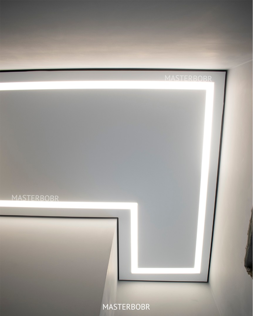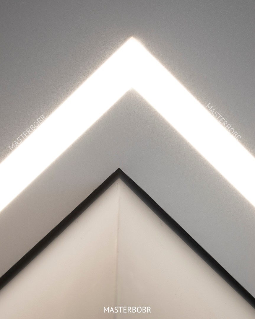 Световые линии при грамотной расстановке освещают комнату ярким и равномерным светом. Это происходит благодаря тому, что мощная светодиодная лента закрывается декоративной вставкой, которая рассеивает свет.