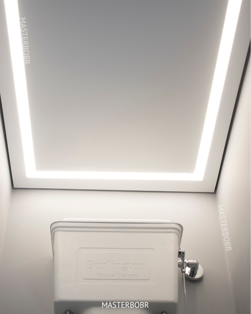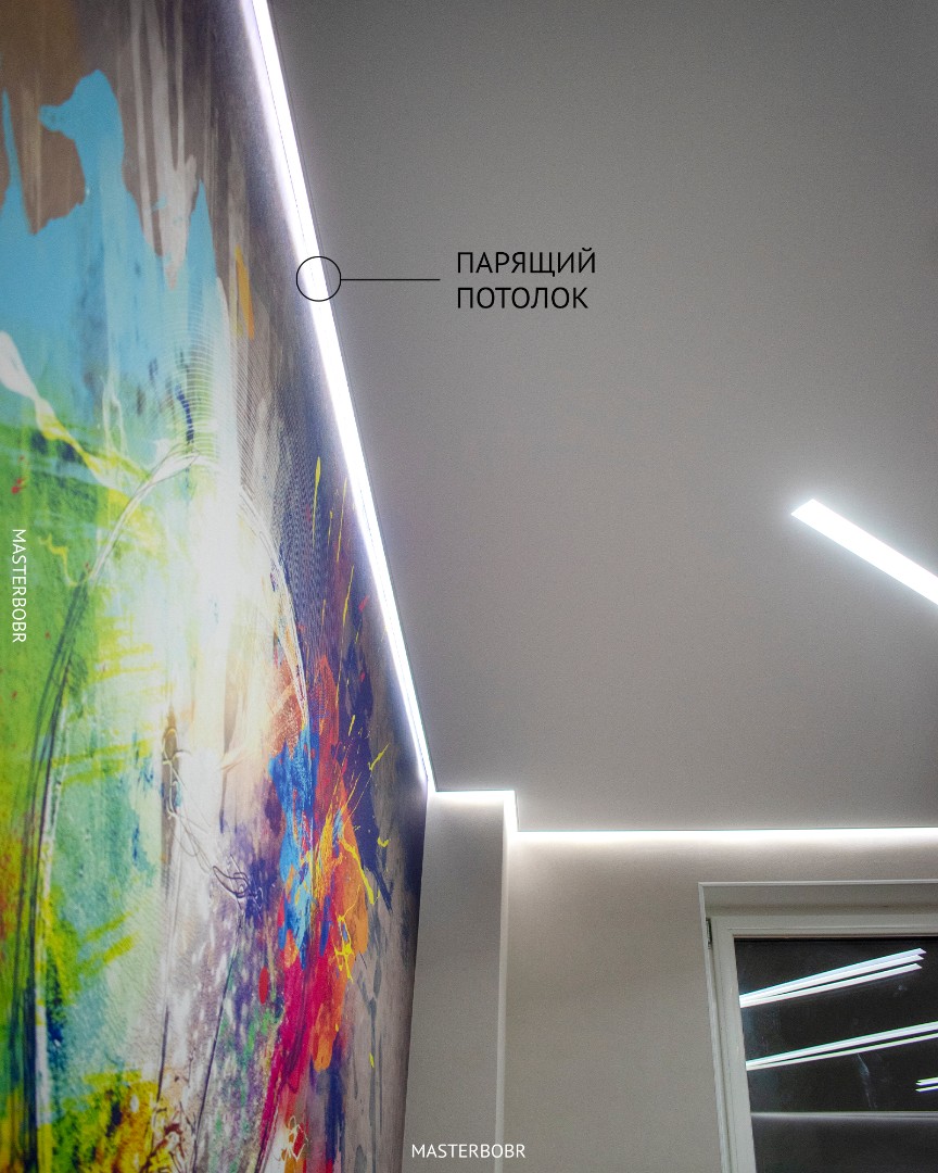 По периметру помещения был установлен парящий потолок. Весь его секрет кроется в специальном профиле, который создает небольшой зазор между потолком и стеной. Что создает эффект того, что потолок не привязан к стене, а просто парит в воздухе. Отсюда и название.
