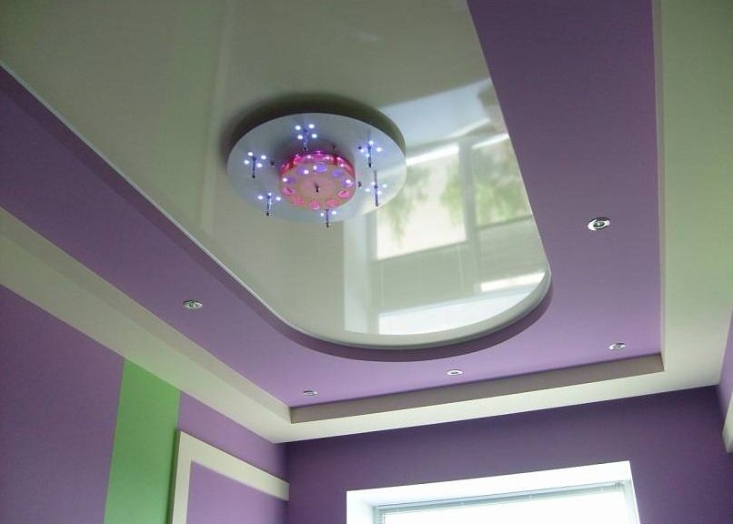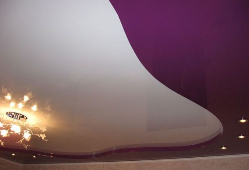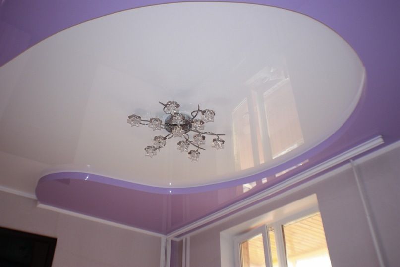 Фиолетово-белый потолок в интерьере можно очень выгодно обыграть с помощью натяжных конструкций, и с таким потолком ваша гостиная станет предметом вашей гордости!