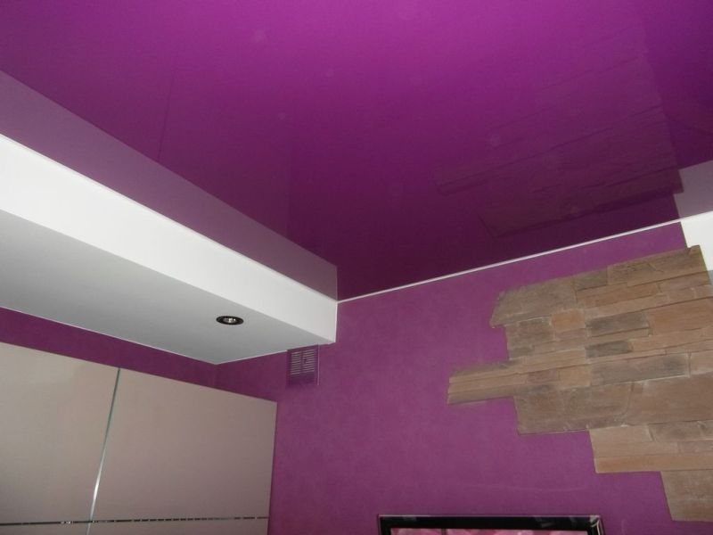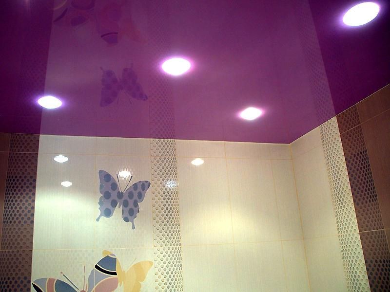 Глянцевый потолок фиолетового цвета отлично оттенит светлую кафельную плитку в ванной комнате, к тому же, материал глянец имеет светоотражающие свойства, и, при грамотно подобранных точечных светильниках, вы можете добиться эффекта «радужных бликов» на стене и потолке.