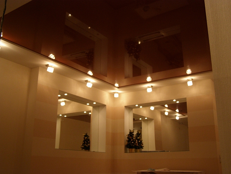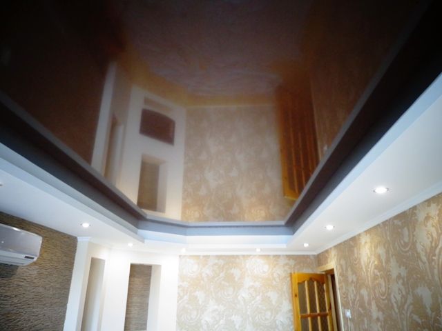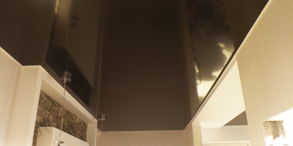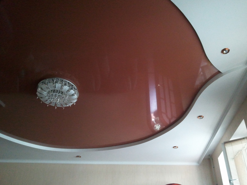 Очень необычно и уютно будет смотреться потолок в ванной из бежевого лакового полотна. На кухне мы бы рекомендовали установить спайку из бело-бежевых потолков, при этом, спайка полотен хороша тем, что визуально разделяет пространство, не снижая высоту потолка.