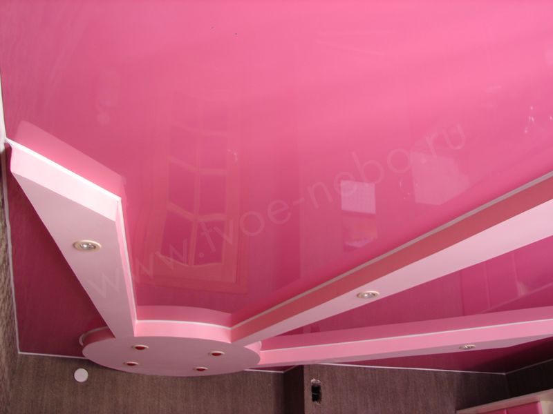 Потолки розового цвета будут смотреться поистине необычно. Розовый потолок в интерьере, вопреки представлениям, может быть использован во многих помещениях. Самый логичный вариант – это установить розовый натяжной потолок в детской для девочки. При этом, на потолок с помощью технологии фотопечати можно нанести любой рисунок – например, любимую принцессу своей дочки, или любой абстрактный узор.
