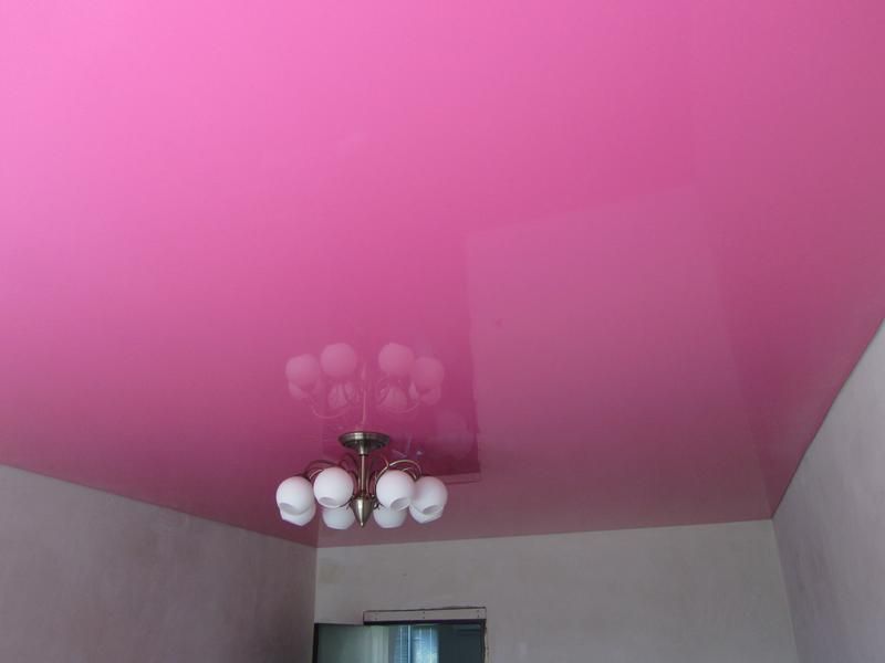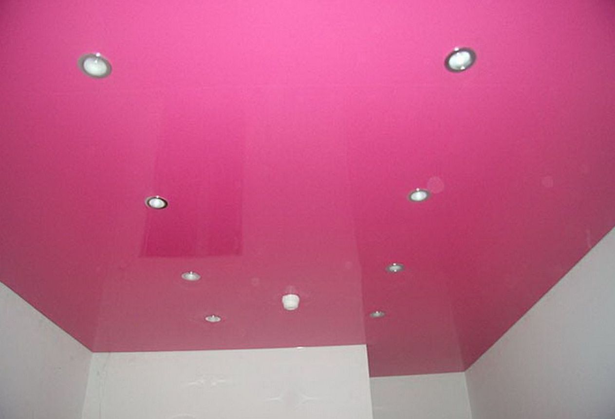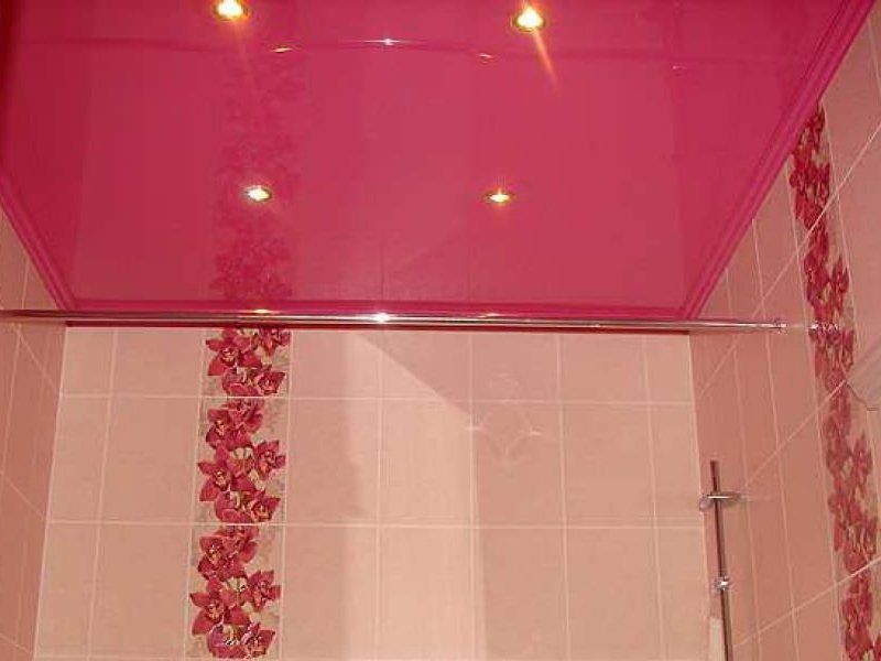 Глянцевый потолок розового цвета будет отлично смотреться в ванной, особенно в сочетании с белой или бежевой плиткой на стенах.