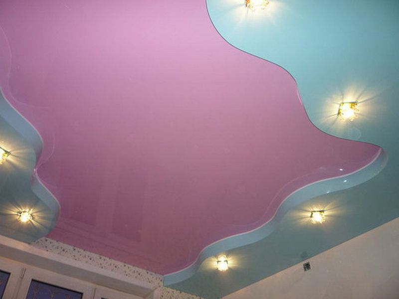 С помощью натяжных конструкций можно комбинировать несколько полотен, и, например, сделать не просто розовый натяжной потолок, а смягчить розовый цвет добавлением белого или бежевого, или же наоборот, подчеркнуть зоны комнаты, сделав над ними цветовой акцент темно-синим или черным цветом.