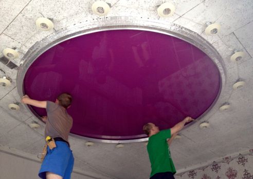 Перед началом работ по натяжке, специалист-монтажник, закрепляет полотно под потолком при помощи специальных захватов. Далее тепловой пушкой полотно разогревают до 70-80 градусов, в результате чего оно становится более эластичным. Теперь можно приступать к натяжке. После того, как полотно натянули, в местах, где были закреплены закладные, приклеиваются термокольца, по внутреннему радиусу кольца вырезаются отверстия под светильники.